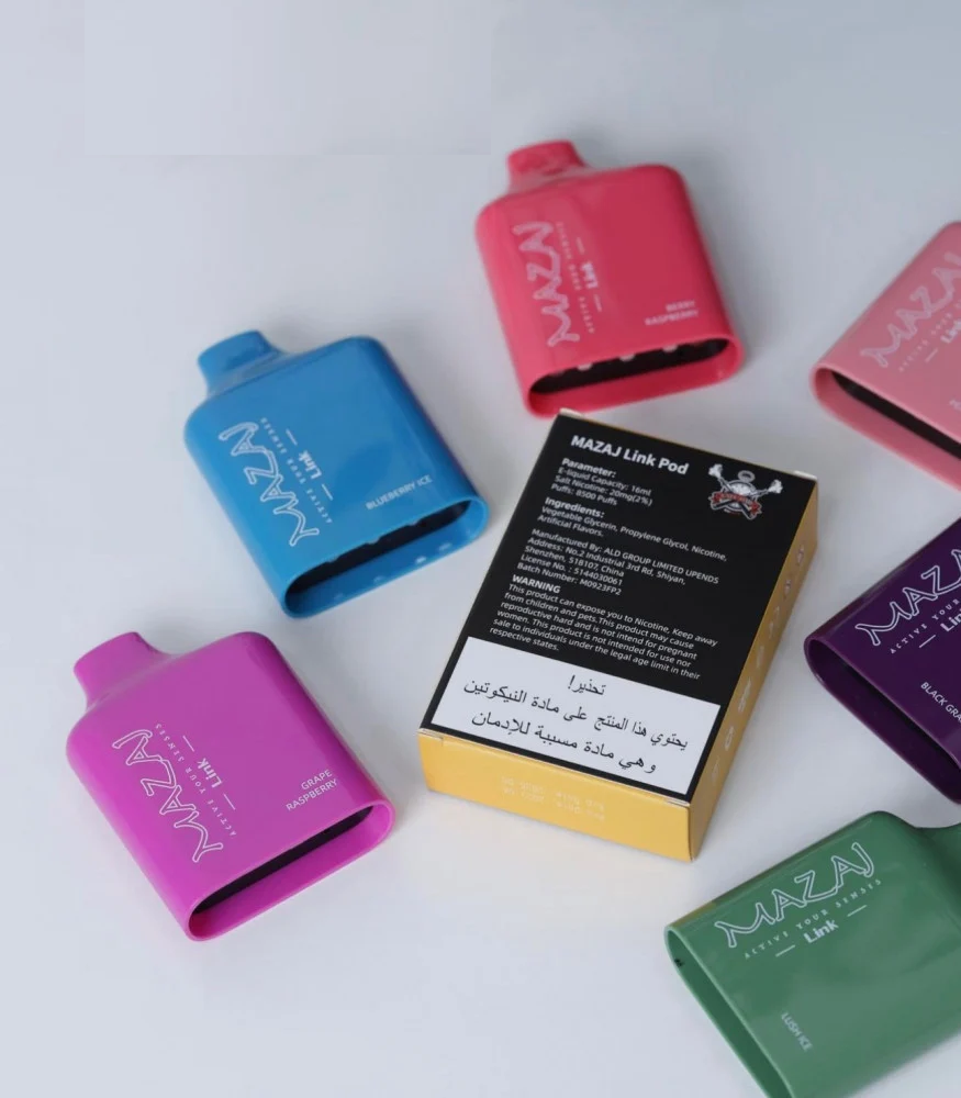 المواصفات:عدد السحبات: 8500نيكوتين : 50mgسعة التانك: 16mlلطلب بطارية جهاز سحبة مزاج Mazaj Link Device