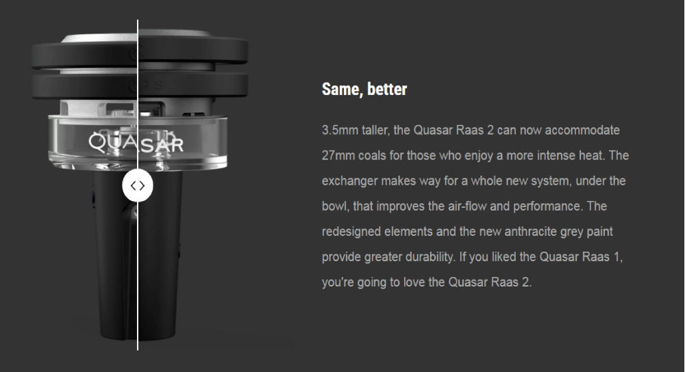 Unlike the 1st version, the Quasar RAAS V2 can contain up to 3 circular coals or 3 cubic coals. It will not be deteriorated by the high intensity of heating.