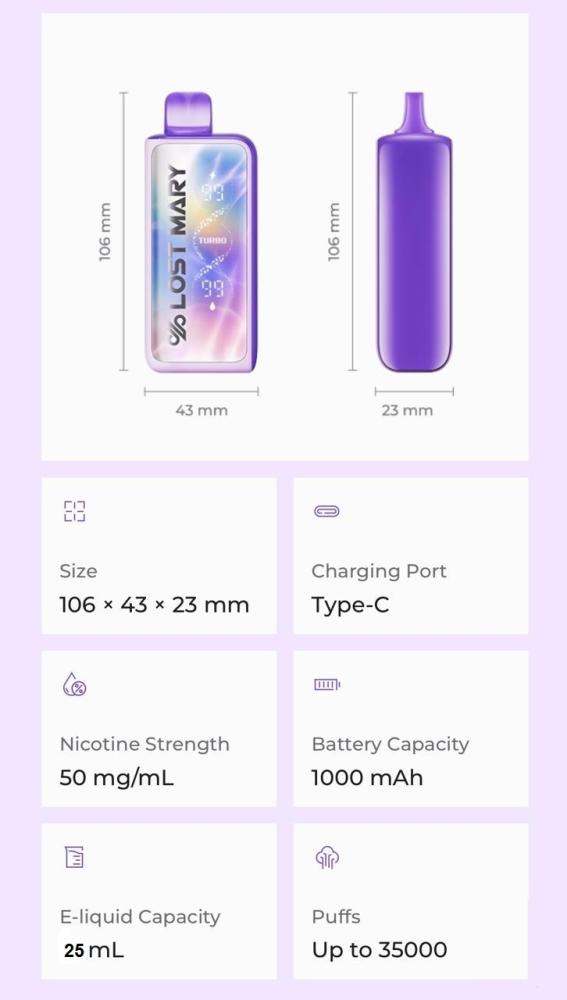 Specifications:Puffs:Smooth Mode 30000Turbo Mode 20000Nicotine: 50mgTank capacity: 25mlIntergrated display to view e-liquid and battery levels only during use, Ensuring a distraction-free, immersive vaping experienceBattery capacity: 1000mAhCharger type: Type-C